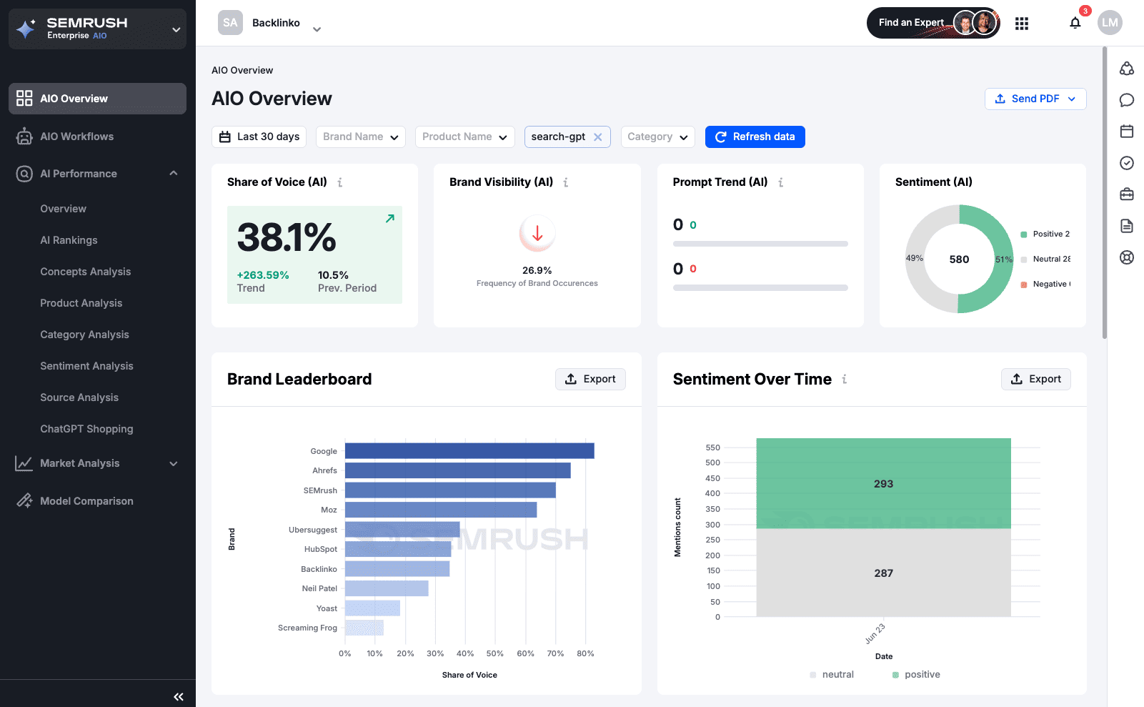 The most powerful thing Semrush offers in the AI space is visibility. Specifically: How is your brand showing up in AI-generated answers across LLMs?